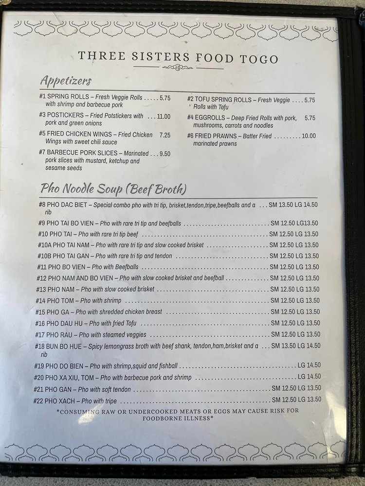 Introducing Three Sisters Food To Go, a Chinese-Vietnamese gem in Spokane, WA. Known for their delectable dishes and exceptional service, this family-owned restaurant offers a wide range of options for every palate. From the flavorful Bar-B-Q Pork Thit heo xa xiu appetizer to the hearty Pho Dic Biet Special combination soup, each dish is crafted with care and precision. Customers rave about the fresh ingredients and friendly atmosphere, with favorites like the Bahn Mi sandwiches and the savory beef pho stealing the show. The menu boasts many vegetarian options and happy hour specials, making it a perfect spot for any occasion. Whether you're craving traditional Vietnamese flavors or exploring new culinary delights, Three Sisters Food To Go is a must-visit destination that promises a memorable dining experience.